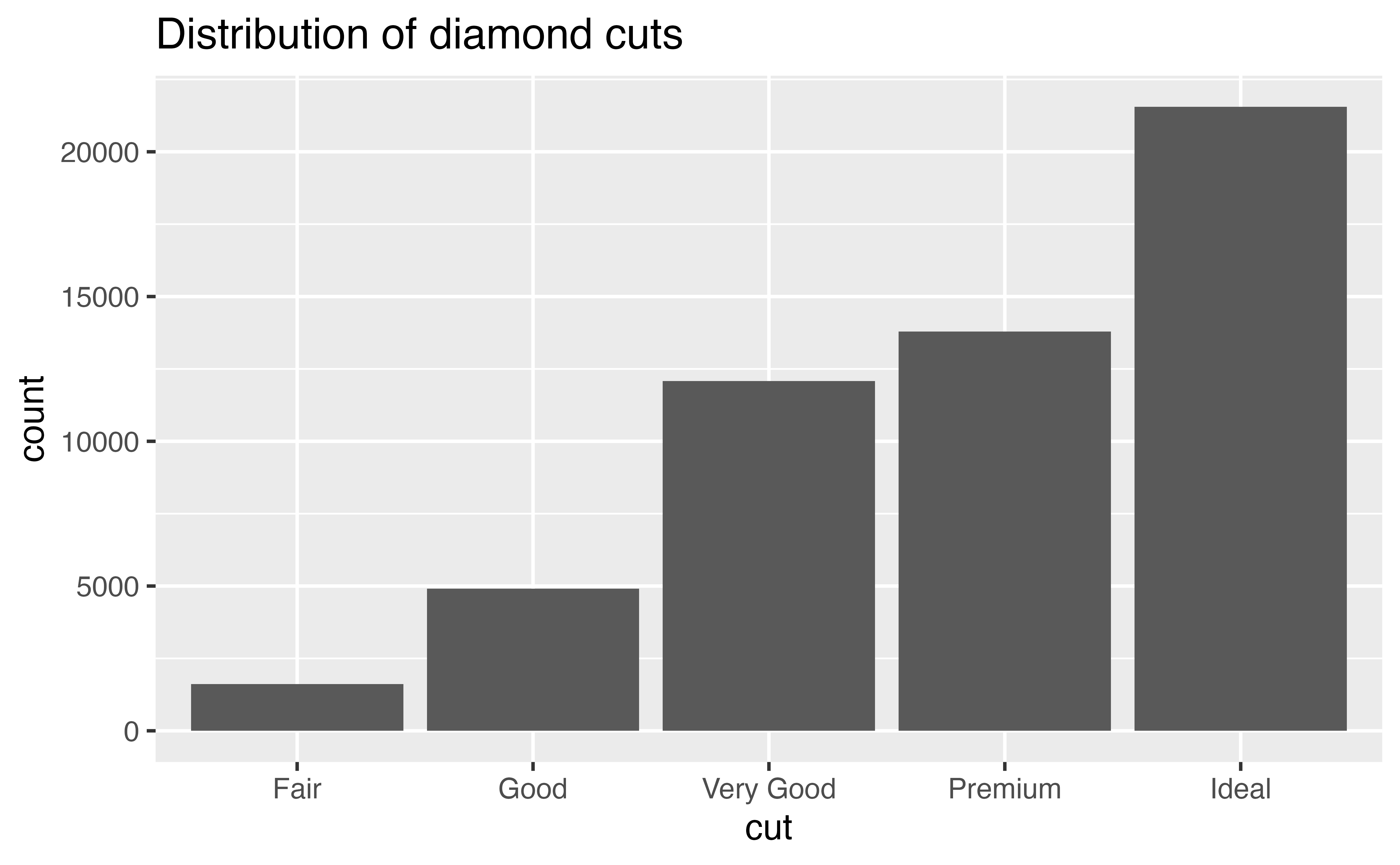 You should not supply a \(y\) aesthetic when you use geom_bar(); {ggplot2} will count how many times each \(x\) value appears in the data, and then display the counts on the \(y\) axis. So, for example, the plot above shows that over 20,000 diamonds in the data set had a value of Ideal.