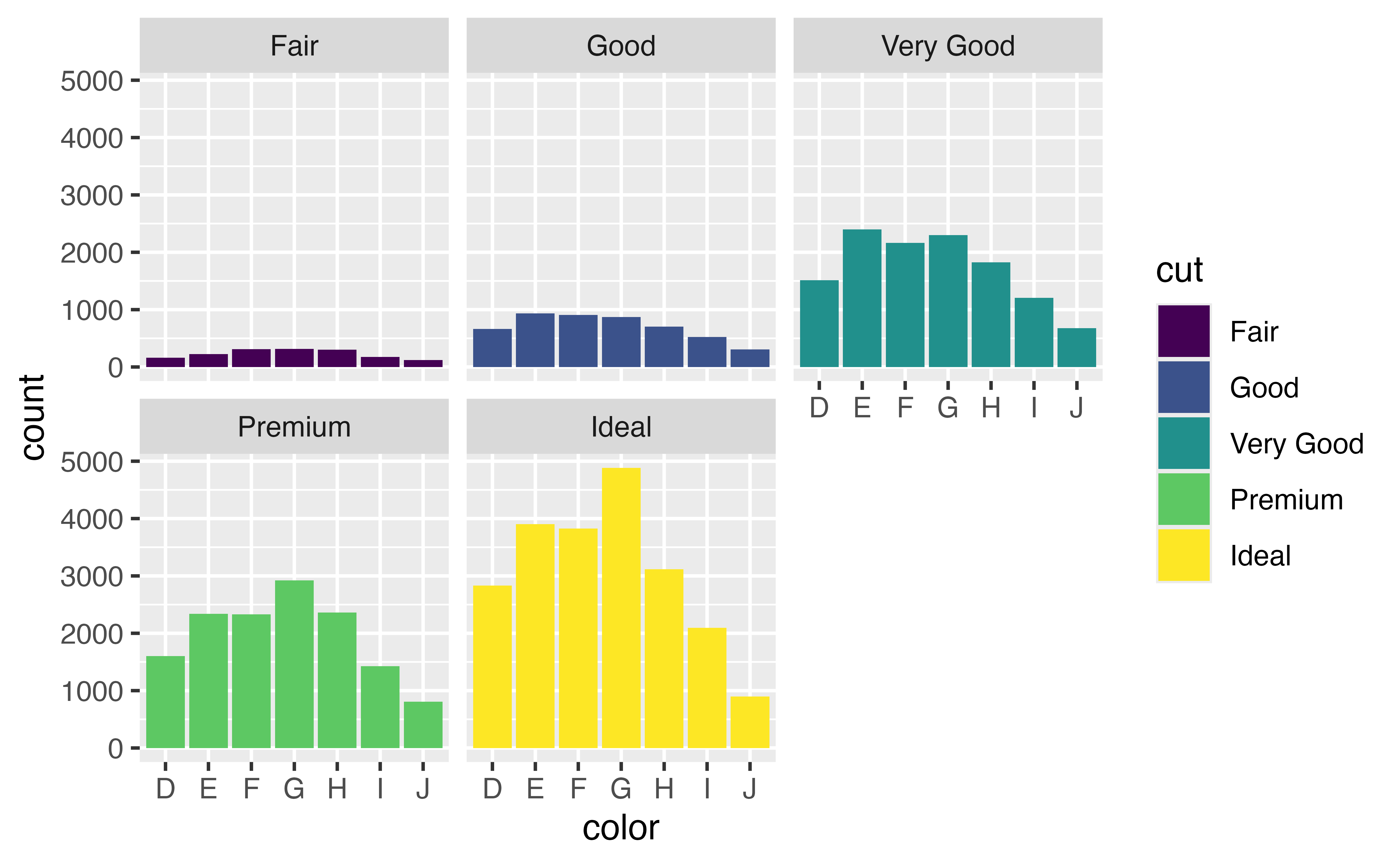 "identity","stack","dodge","fill","nudge", and"jitter"(we’ll learn about"nudge"and"jitter"later). Each geom comes with its own sensible default. - You can facet any {ggplot2} plot by adding