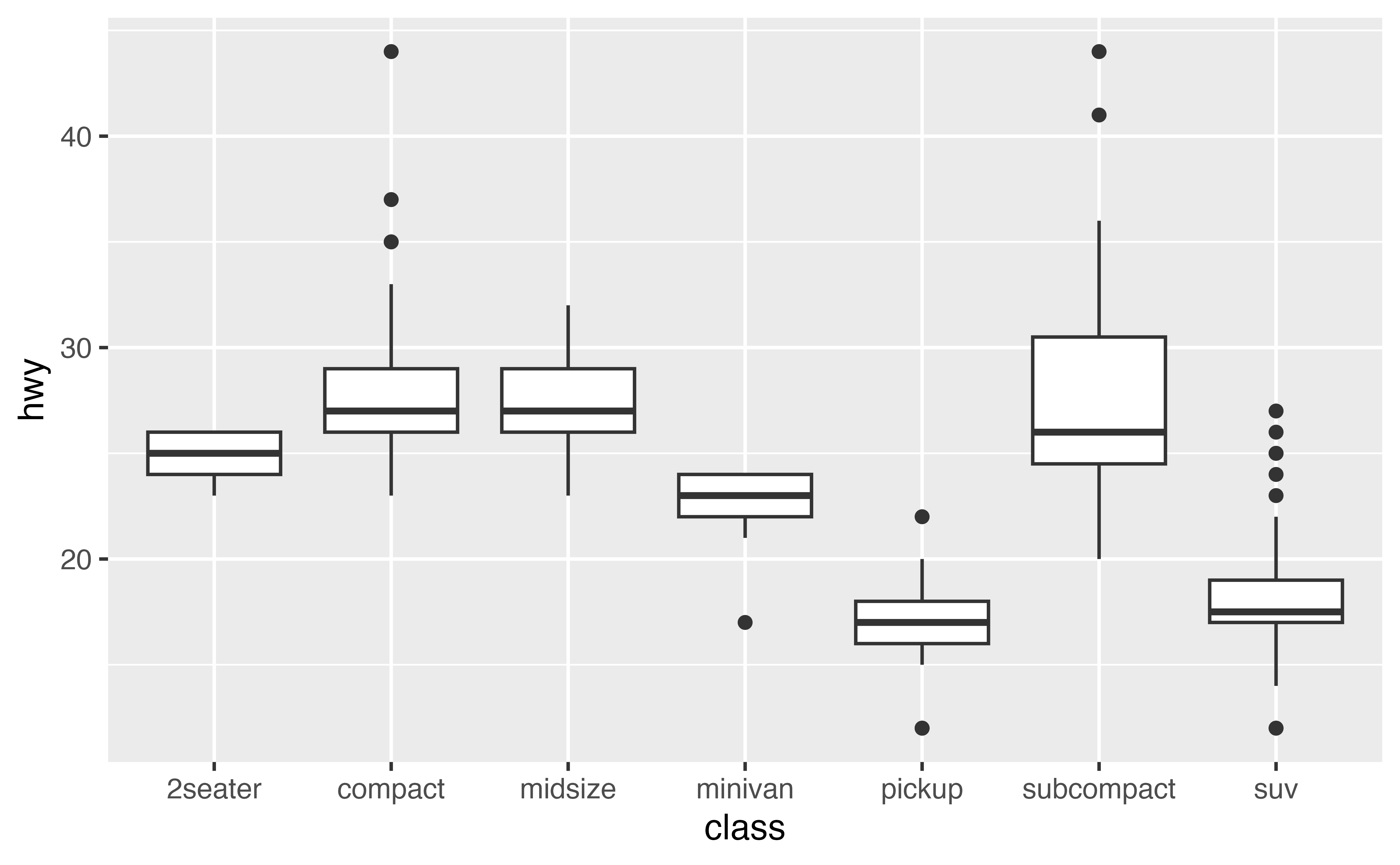 geom_boxplot() expects one x- or y-axes to the continuous and one to be categorical. For example, here class is categorical. geom_boxplot() will automatically plot a separate boxplot for each value of \(x\). This makes it easy to compare the distributions of points with different values of \(x\).