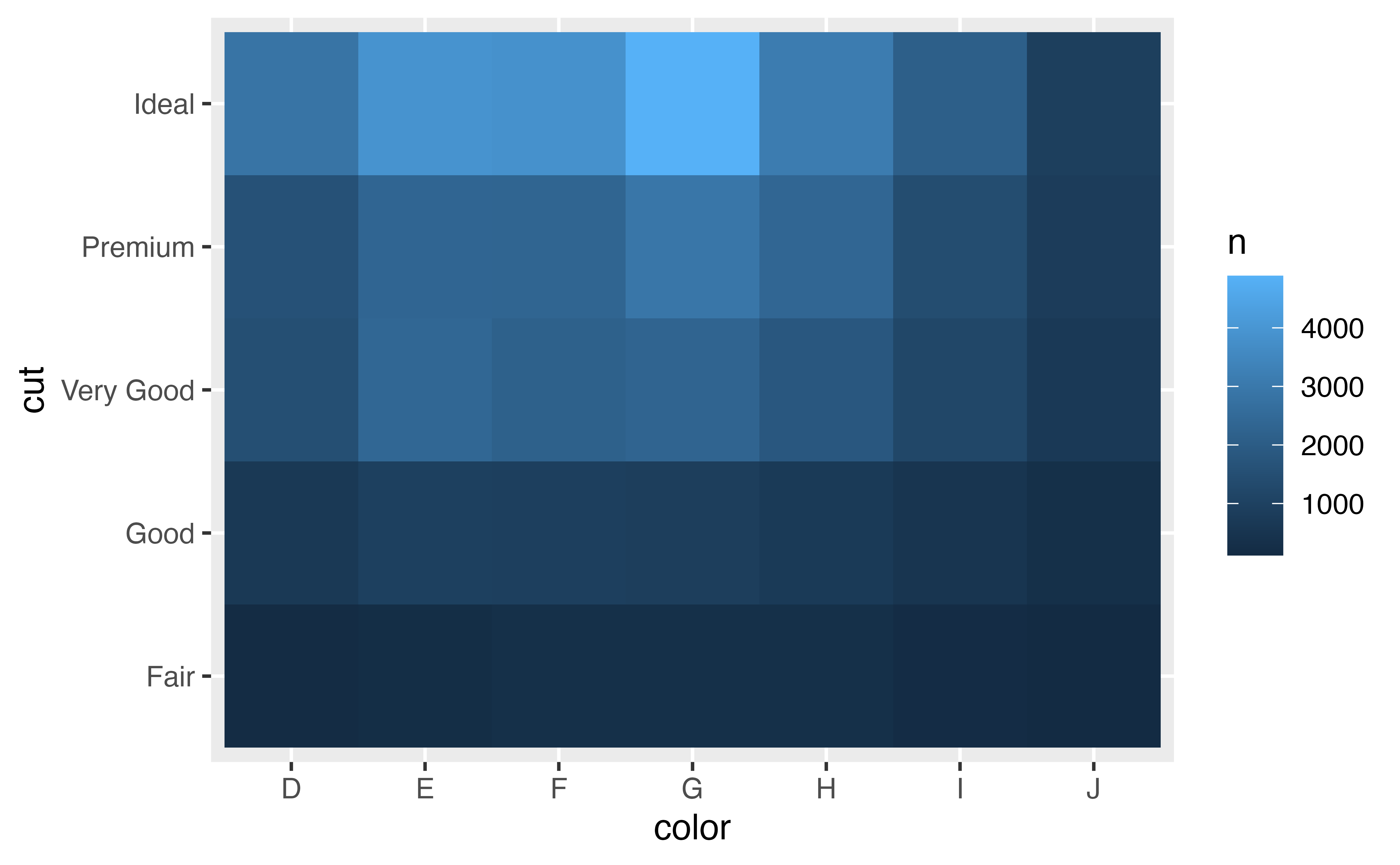 To do this, set the x and y aesthetics of geom_tile() to the variables that you pass to count(). Then map the fill aesthetic to the n variable computed by count(). The plot below displays the same counts as the plot in Exercise 8.