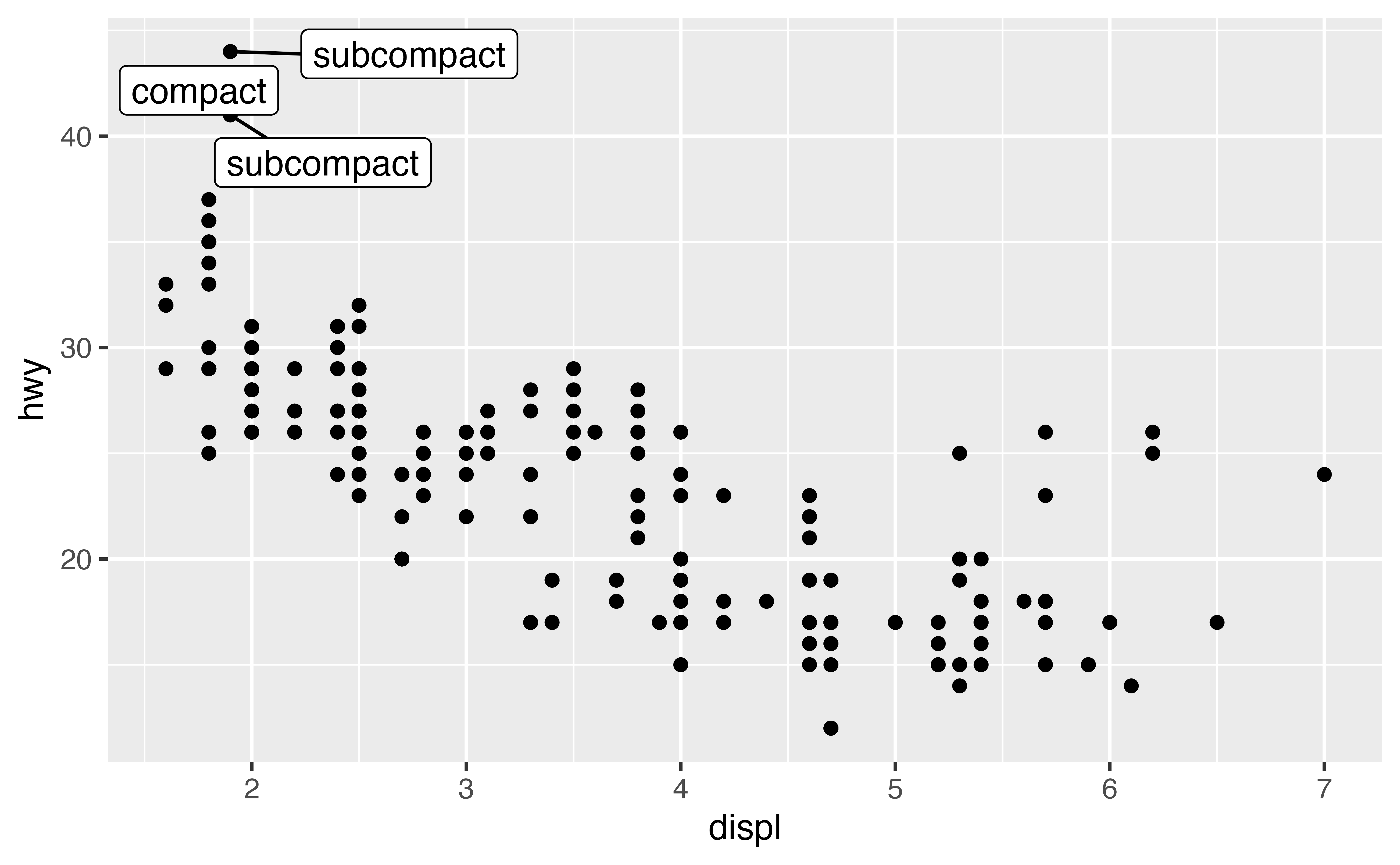 geom_label_repel(data = mpg3, mapping = aes(label = class))Good job!