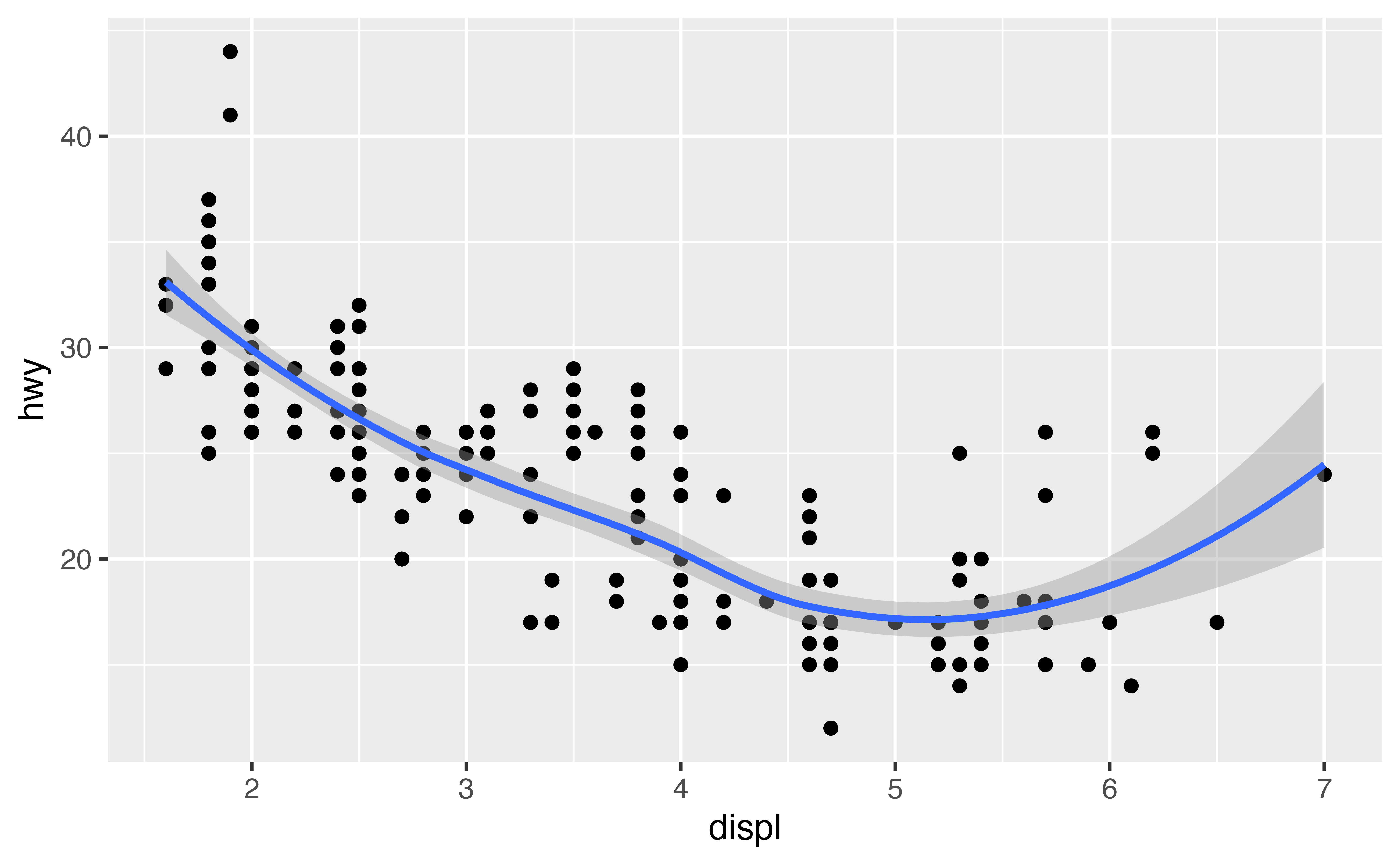 In {ggplot2}, you can add multiple geoms to a plot by adding multiple geom functions to the plot call. For example, the code below creates a plot that contains both points and a smooth line. Imagine what the results will look like in your head, and then run the code to see if you are right.