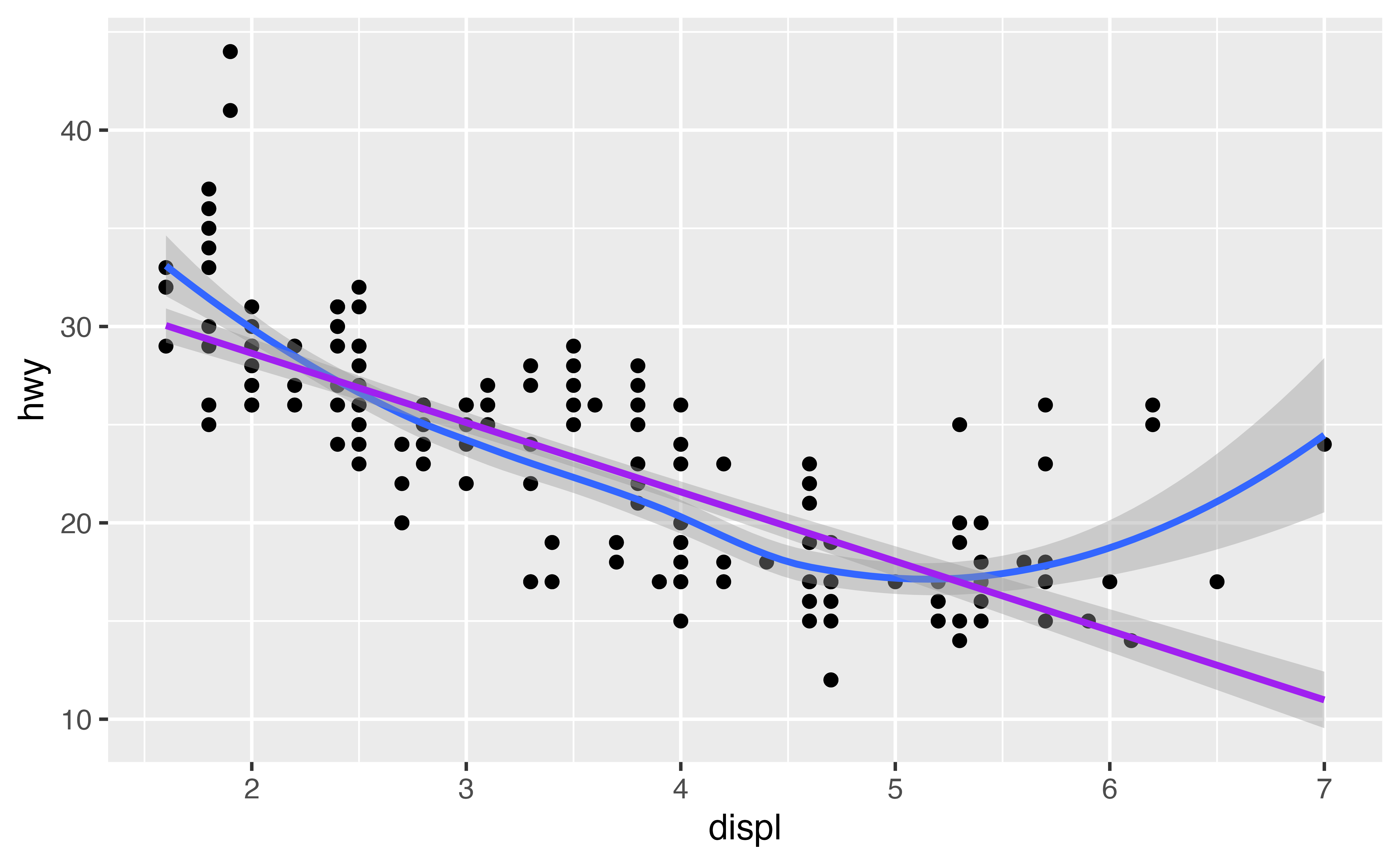 geom_smooth() becomes much more useful when you combine it with geom_point() to create a scatterplot that contains both: