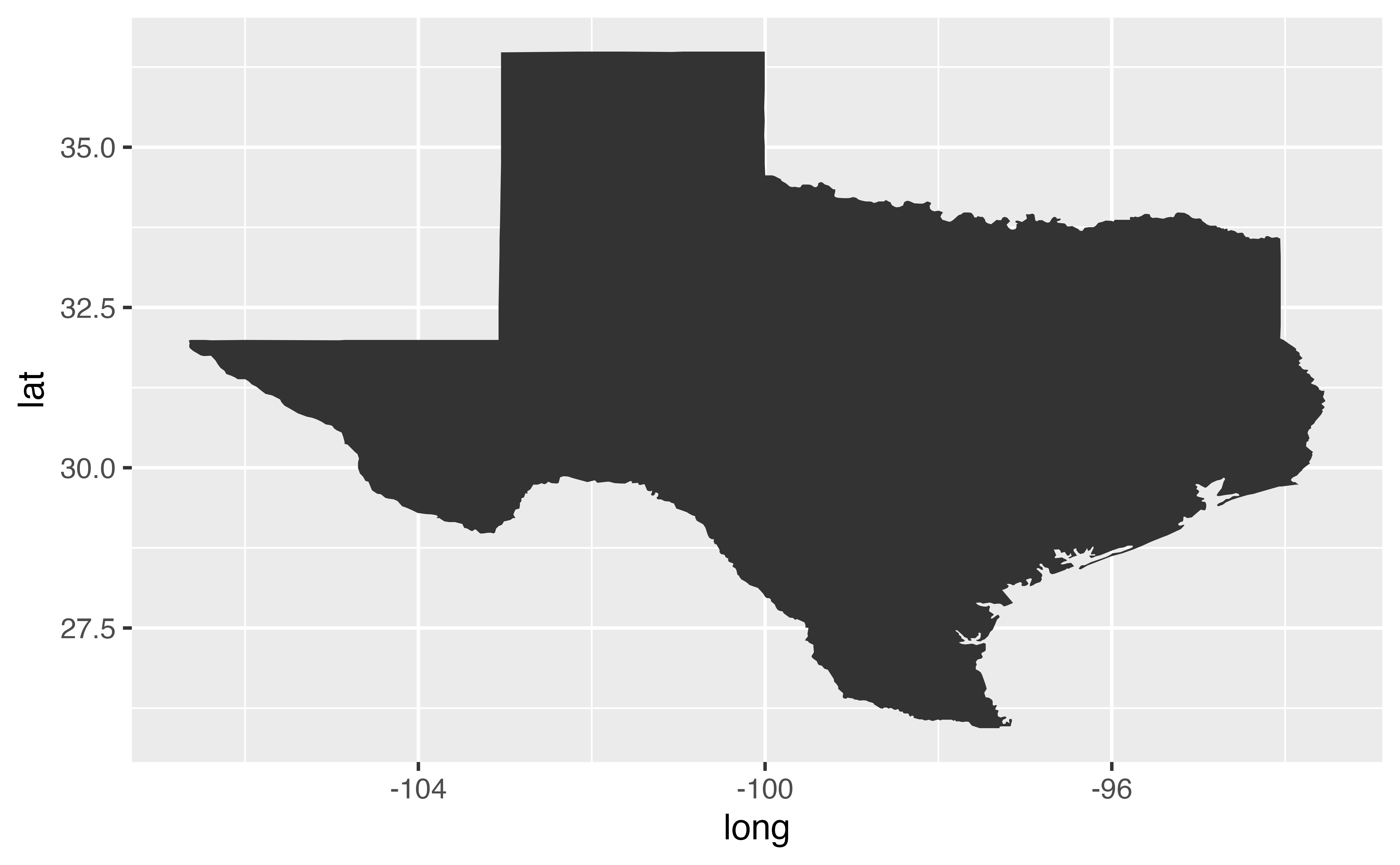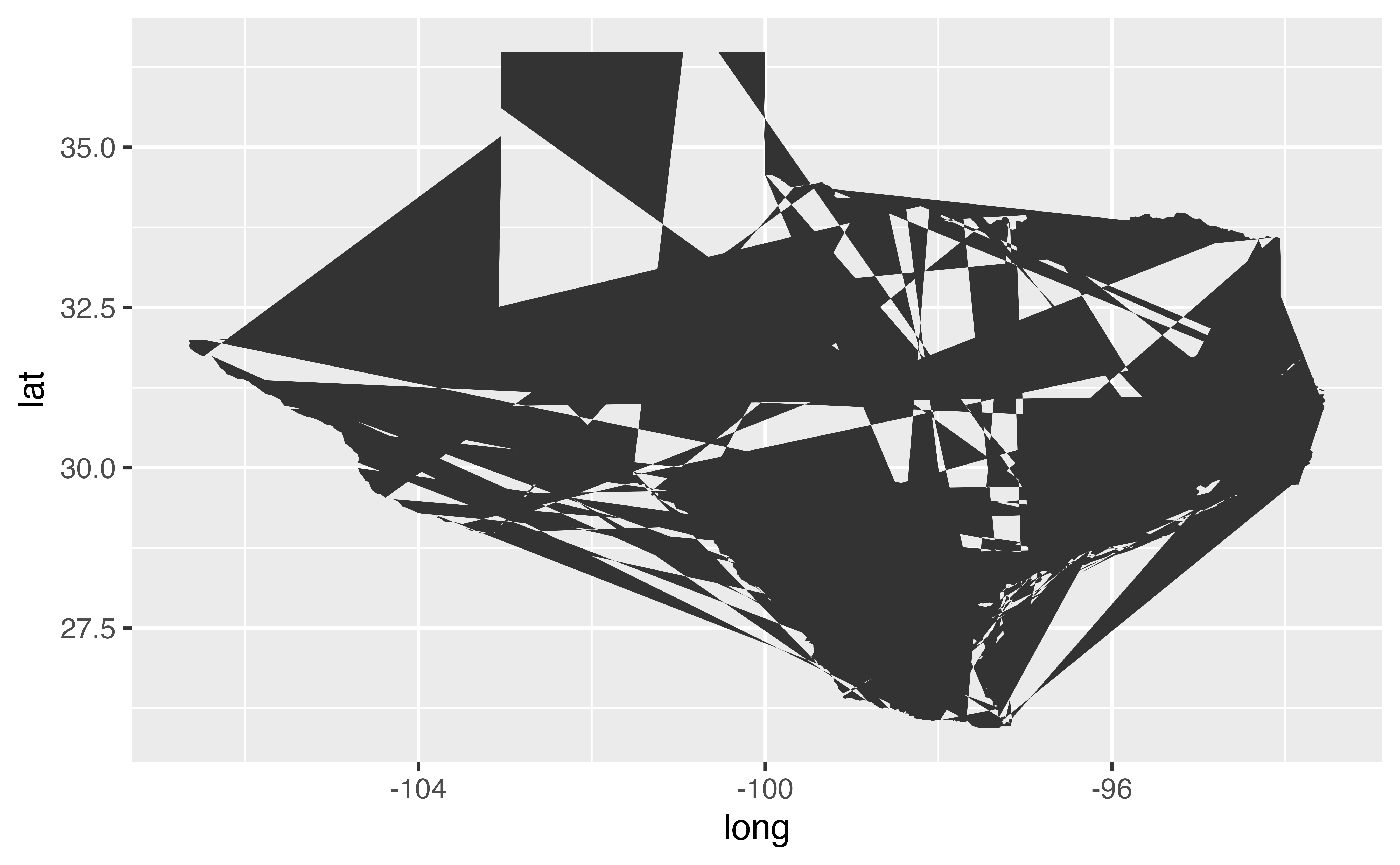 Good job! geom_path() reveals how you can use what is essentially a line plot to make a map (this is a map of the state of Texas). There are other better ways to make maps in R, but this low tech method is surprisingly versatile.