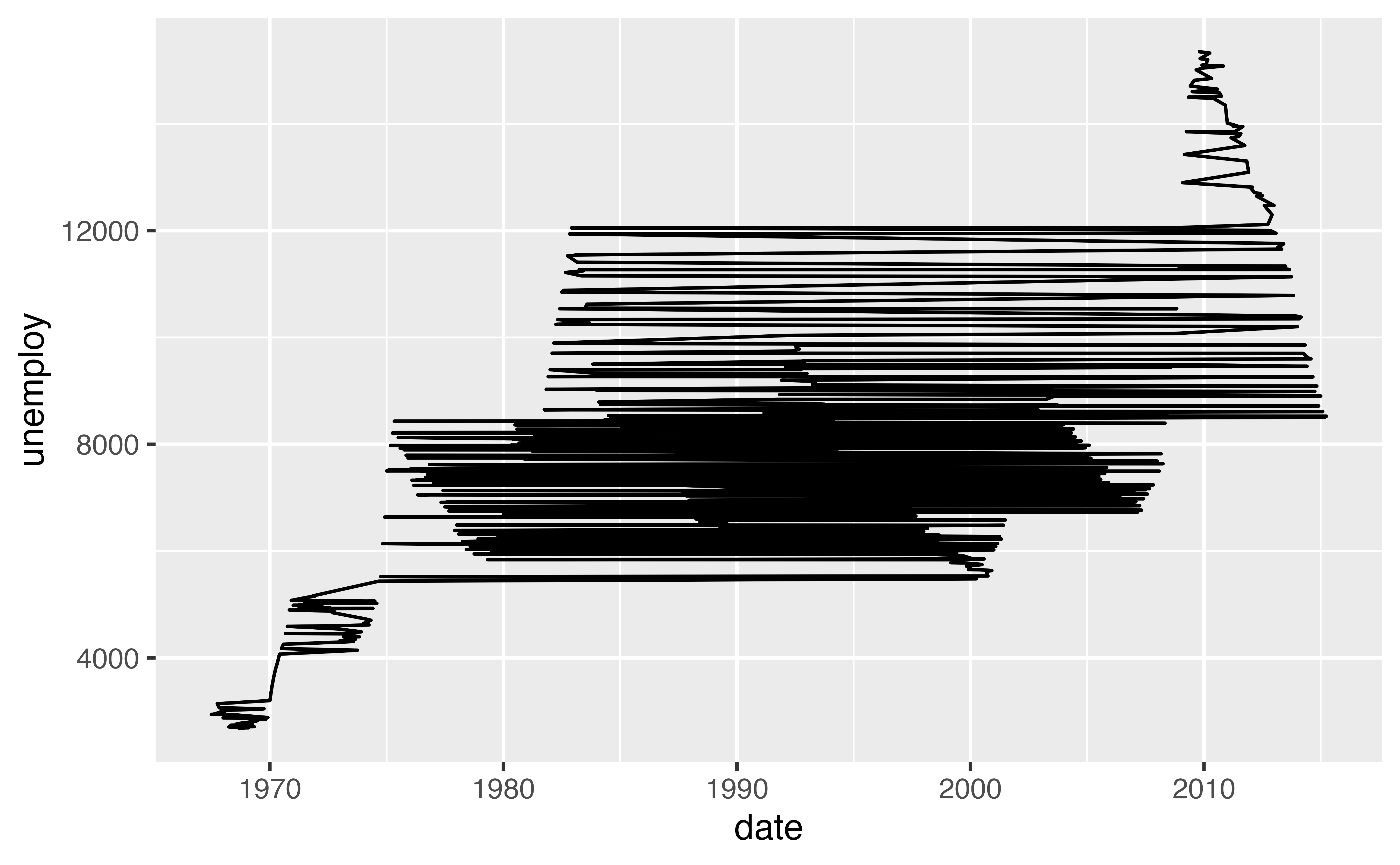 To see how geom_path() does this, let’s rearrange the rows in the economics dataset. We can reorder them by unemploy value. Now the data set will begin with the observation that had the lowest value of unemploy.