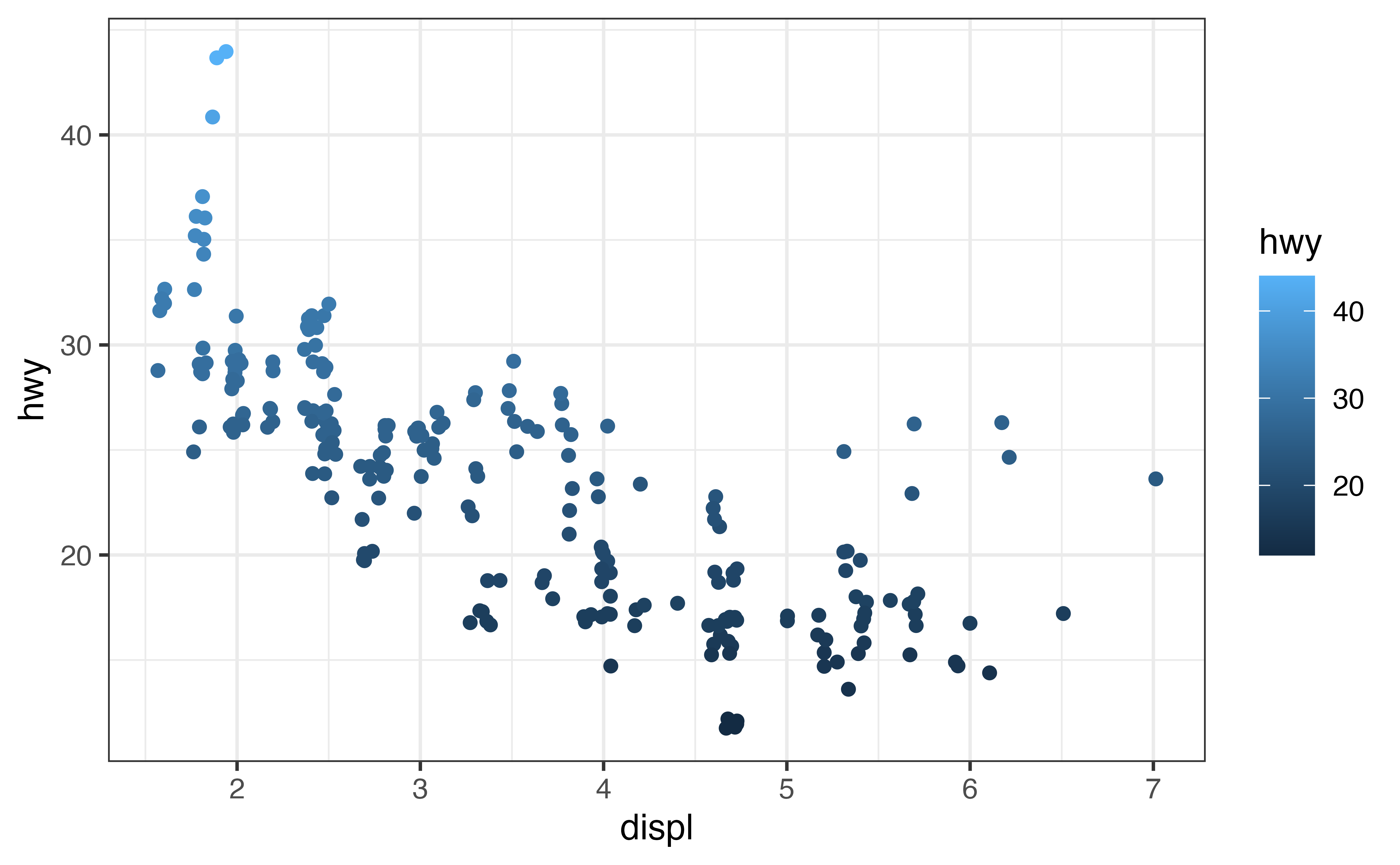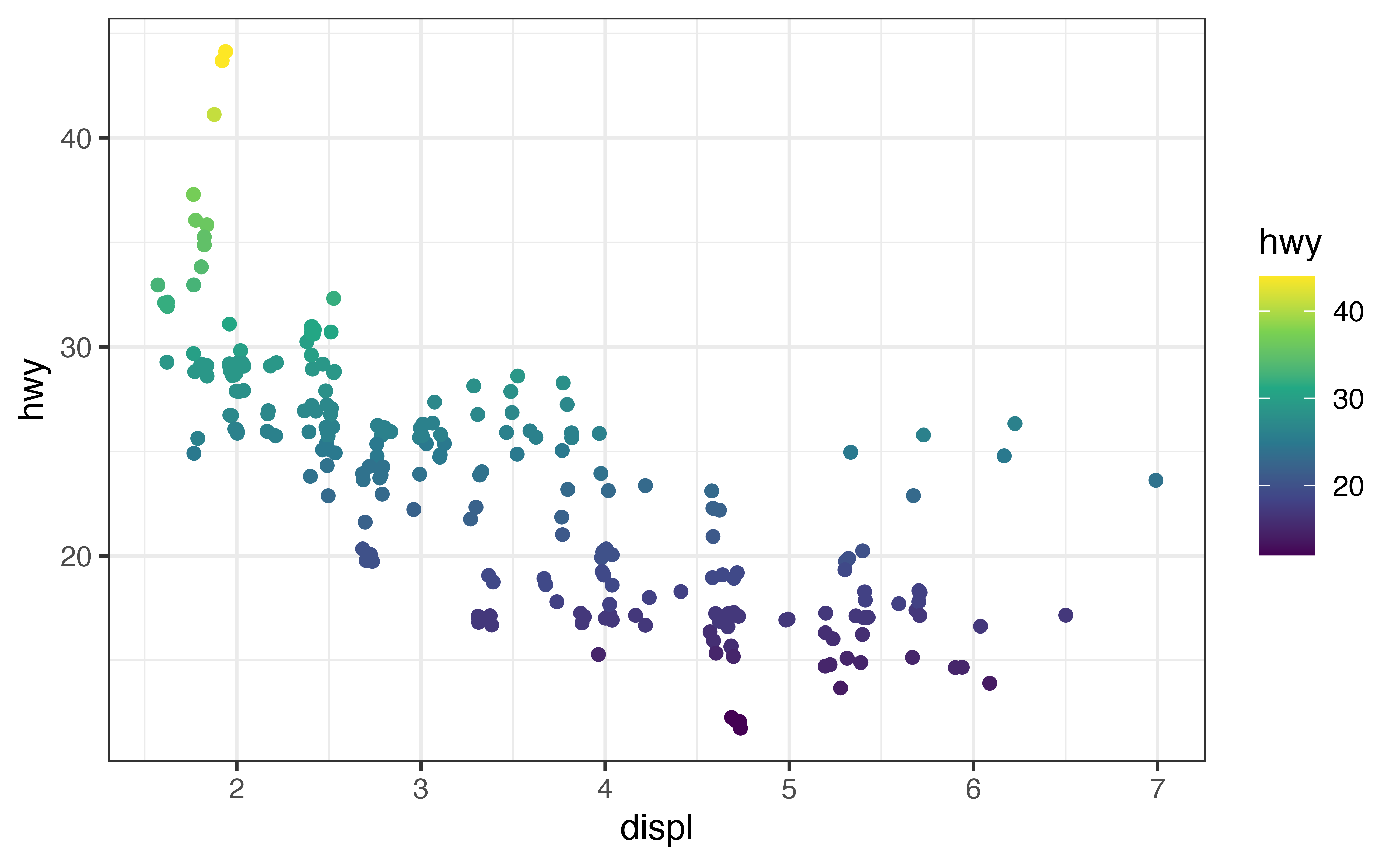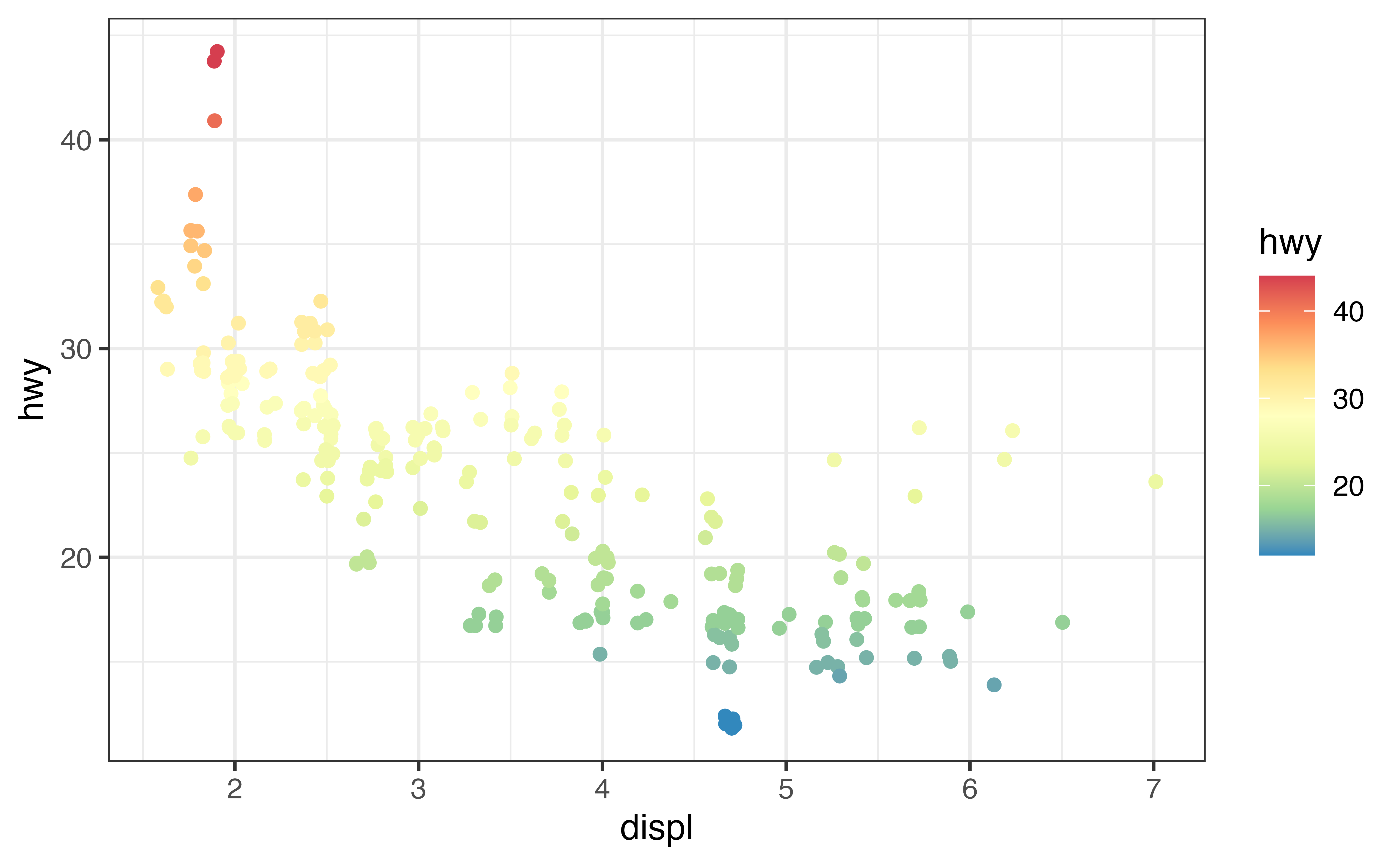 If we apply scale_color_brewer() to our new plot, we get an error message that confirms what you know: you cannot use a scale that is built for discrete variables to customize the mapping to a continuous variable.